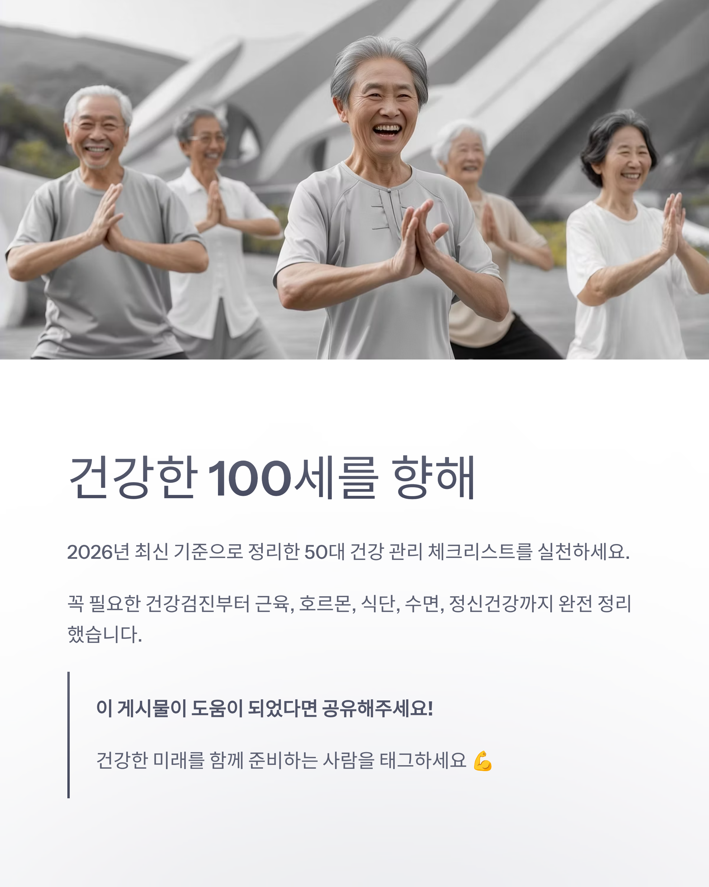 2026년 최신 기준으로 정리한 50대 건강 관리 체크리스트. 꼭 필요한 건강검진 항목부터 근육, 호르몬, 식단, 수면, 정신건강까지 완전 정리!