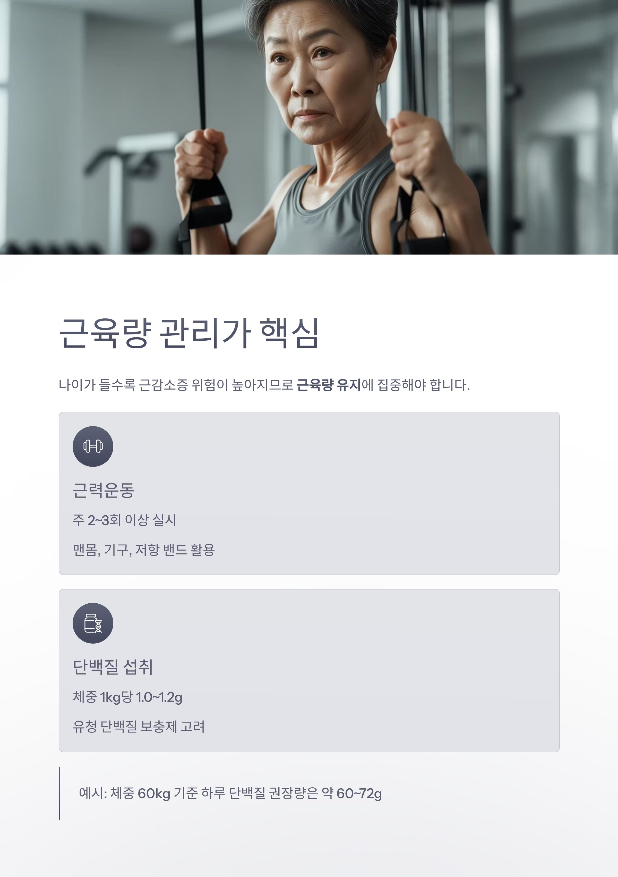나이가 들수록 근감소증(Sarcopenia) 위험이 높아지므로 단순히 체중이 아닌 근육량 유지에 집중해야 합니다.