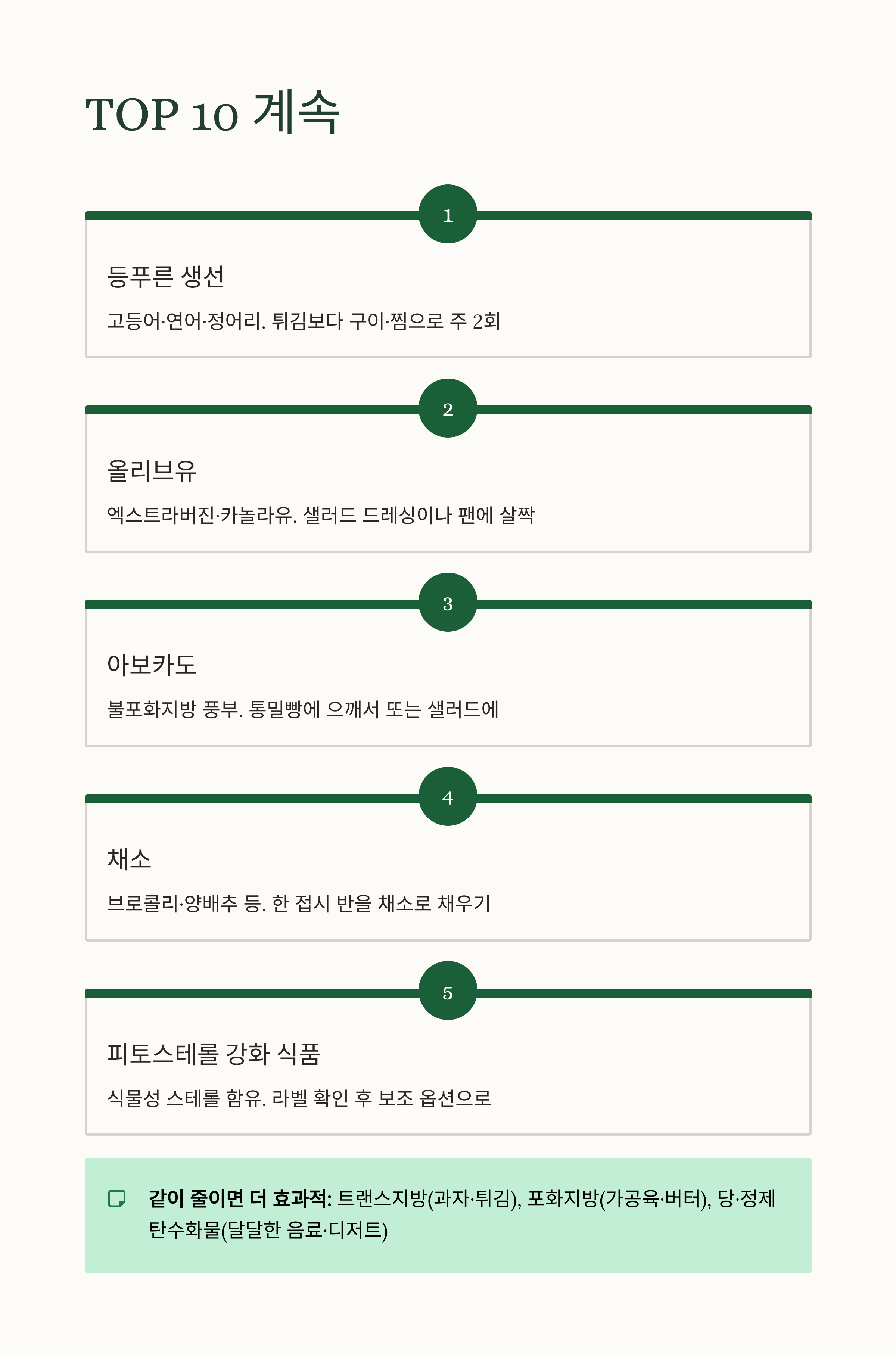 버터/삼겹살/가공육/튀김/과자류에 많은 포화지방·트랜스지방을 줄이고, 올리브유·견과·생선 같은 불포화지방으로 “교체”하는 방식이 도움이 됩니다. (www.heart.org) - 수용성 식이섬유(끈적한 섬유) 늘리기