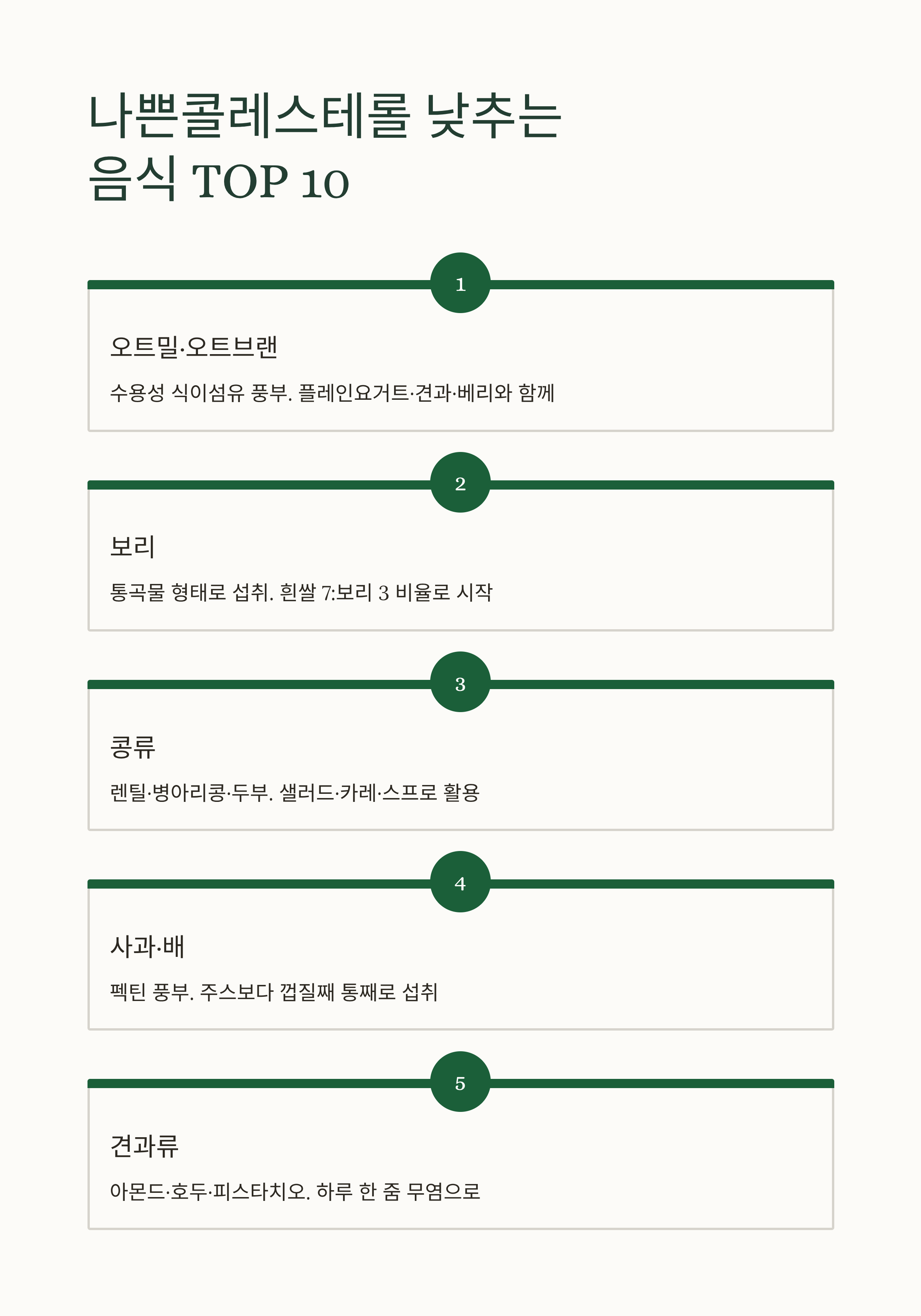 아래 10가지는 “특별한 약 같은 음식”이라기보다, 매일 한 끼에 하나씩만 끼워 넣어도 LDL 관리에 도움이 되는 대표 선수들이에요.