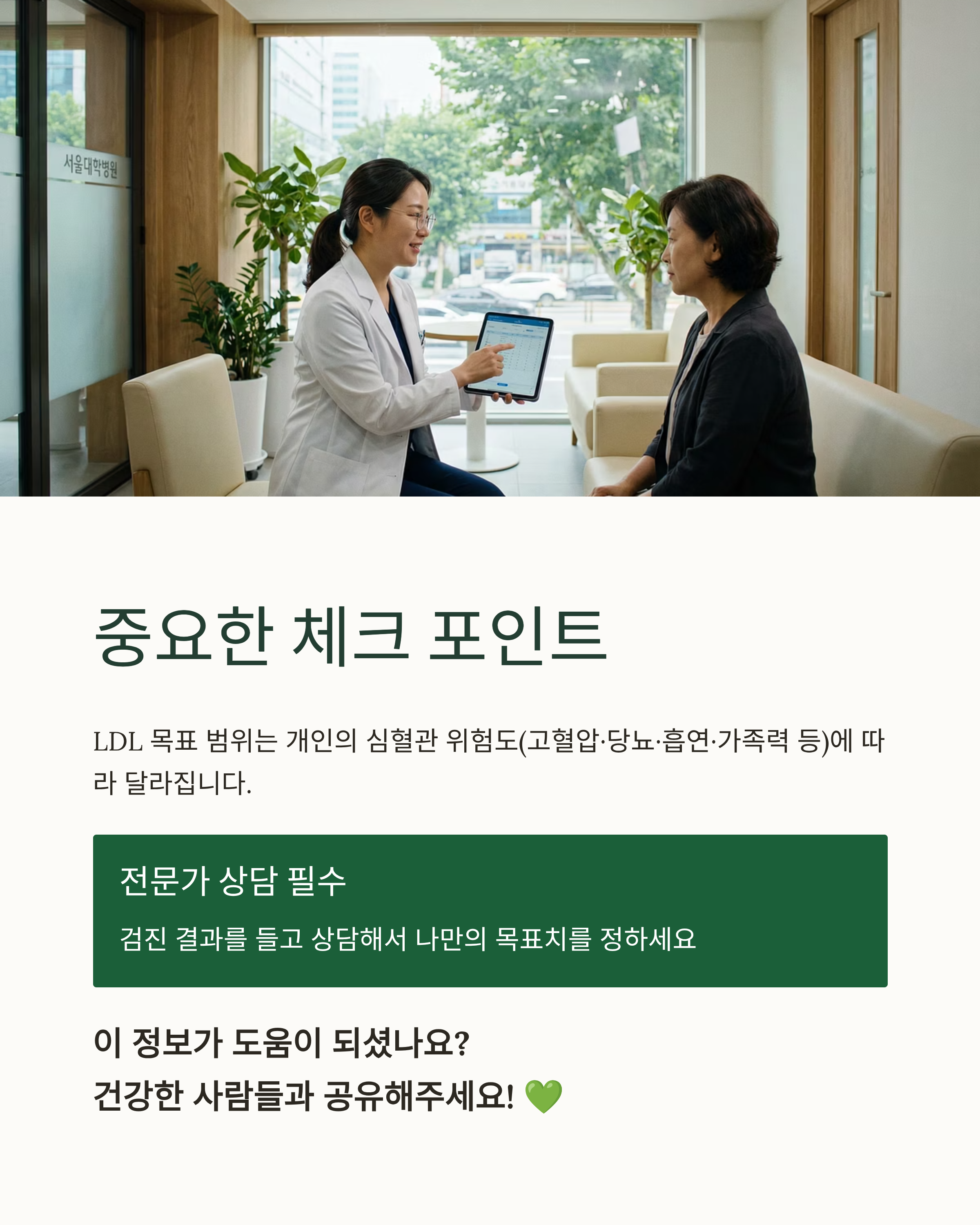 LDL 목표 범위는 **개인의 심혈관 위험도(고혈압·당뇨·흡연·가족력·기존 질환 등)**에 따라 달라질 수 있어요. 수치가 높게 나왔다면 식단만으로 끙끙대기보다, 검진 결과를 들고 상담해서 “내 목표치”를 잡는 게 마음도 훨씬 편합니다.