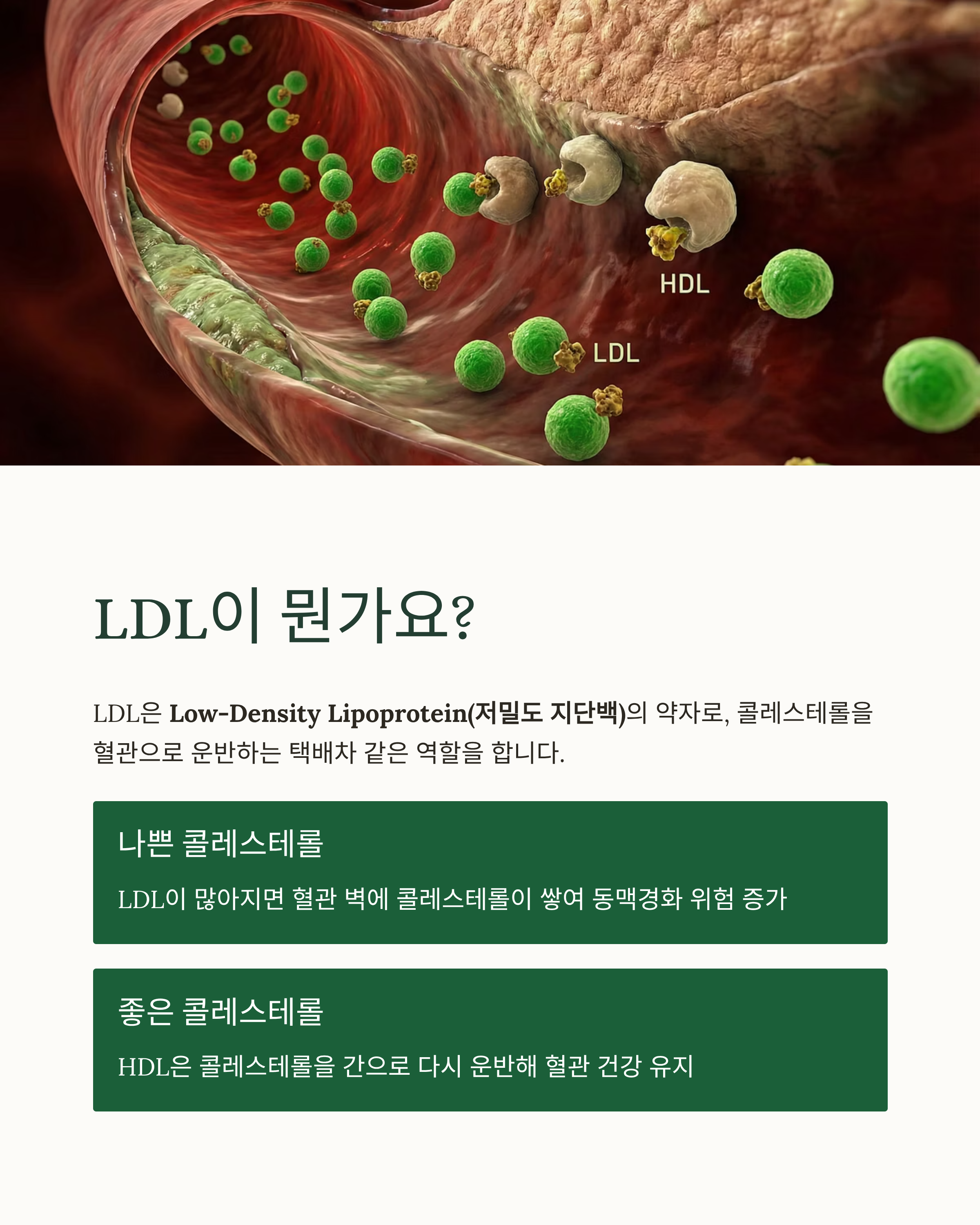 LDL은 **Low-Density Lipoprotein(저밀도 지단백)**의 약자인데, 쉽게 말하면 콜레스테롤을 몸 곳곳(특히 혈관)으로 운반하는 택배차 같은 역할을 합니다. 문제는 LDL이 많아지면 혈관 벽에 콜레스테롤이 쌓이면서 동맥경화(혈관이 좁아지고 딱딱해지는 상태) 위험이 커질 수 있다는 점이에요. (MedlinePlus)