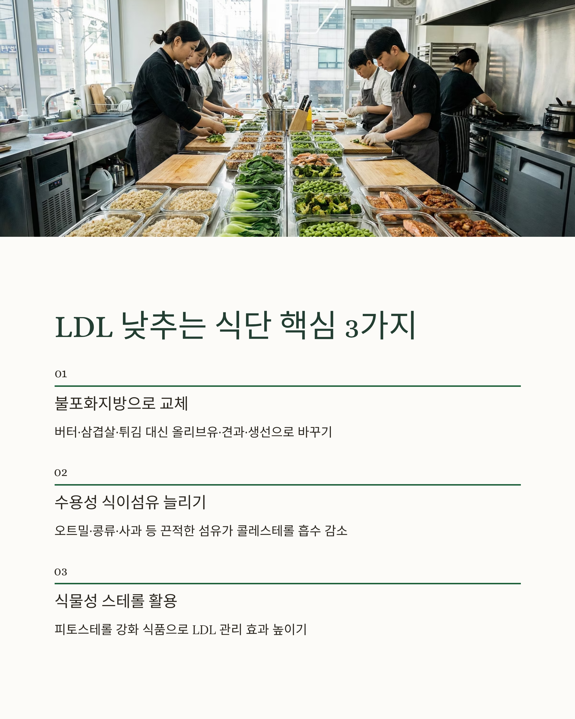 음식으로 LDL을 관리할 때 포인트는 딱 세 가지로 정리됩니다.