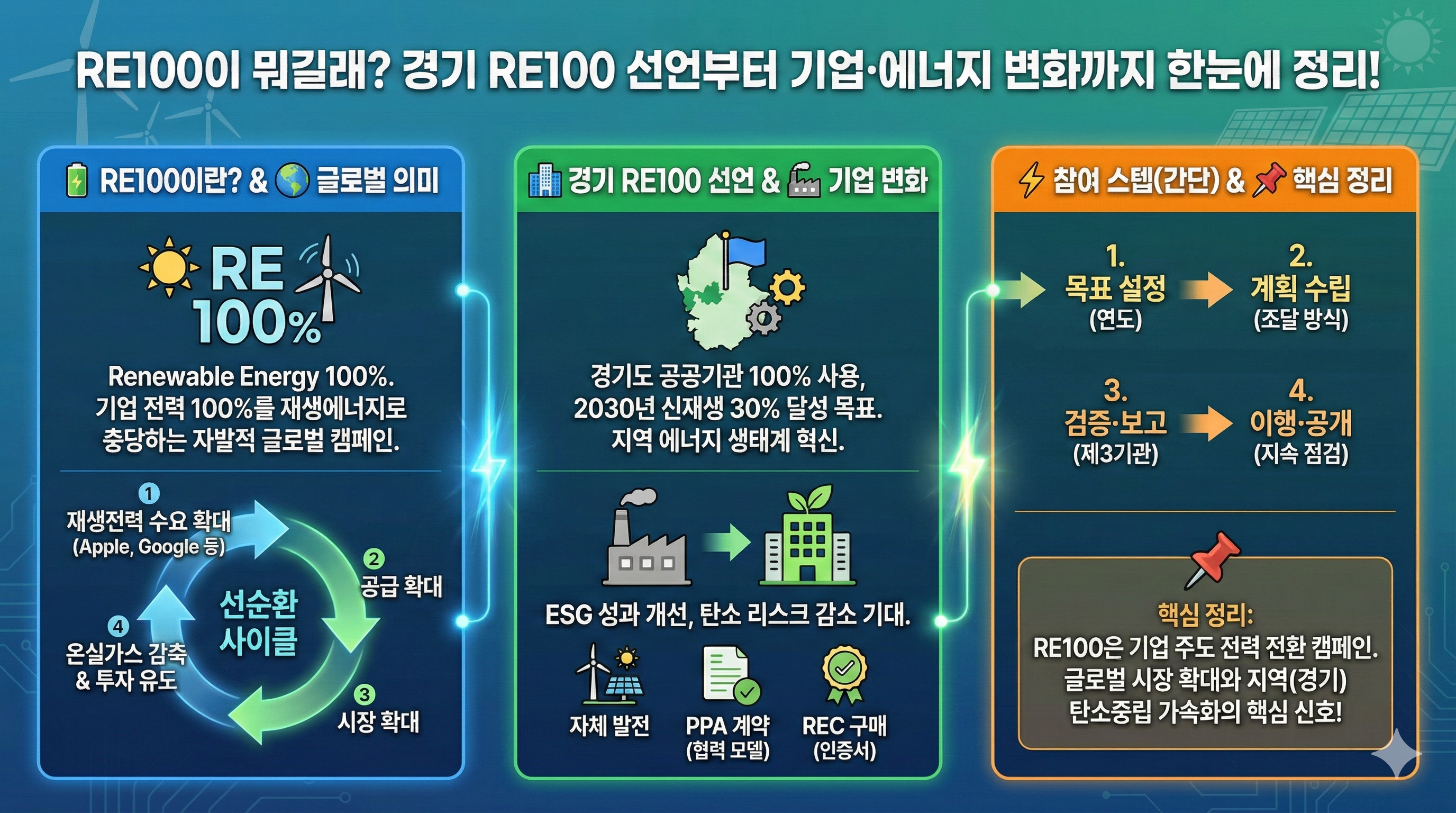 RE100은 기업이 사용하는 전력을 100% 재생에너지로 전환하겠다는 글로벌 이니셔티브입니다. 경기 RE100 선언과 기업들의 변화까지 핵심 내용을 정리했습니다.
